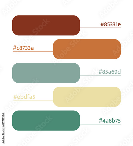 Boho earthy color palette, earthy vibrant colors catalog, color matching, RGB, CMYK, Pantone colors, harmonious colors palette sample, design and edit idea, with hex code
