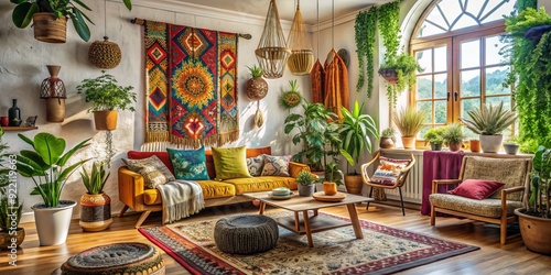 Boho Eclectic Getaway: Vibrant colors, ethnic patterns, eclectic furniture, macrame, plants