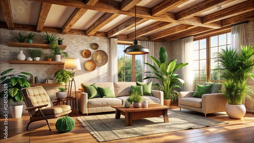 Boho Living Room Decor: Wooden Beams, Plants, Bright Interior Design