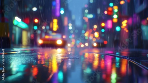 Bokeh effect of colorful traffic lights shimmering on a rainy street creating an artistic urban atmosphere