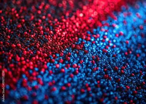 Bold and vibrant abstract texture combining red and blue hues, complete with grainy elements, dark noise accents, and generous copy space for design inspiration.