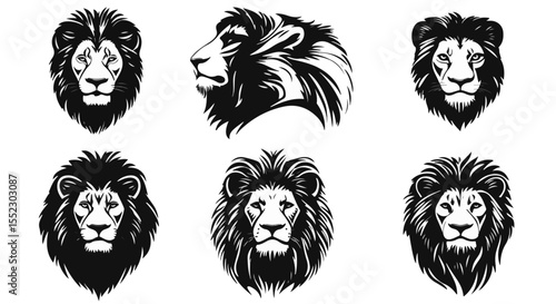 Bold lion head vectors feature strong black and white designs, perfect for graphics, tattoos, and symbolic artwork.
