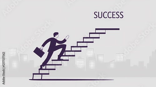Bold minimalism illustration of a person climbing a ladder labeled "Success," holding a briefcase, with a cityscape background featuring buildings