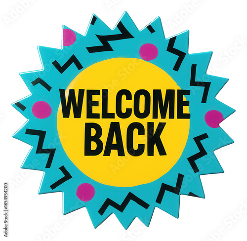 Bold star-shaped sticker featuring WELCOME BACK message in vibrant colors, eye-catching retail promo design on transparent background.