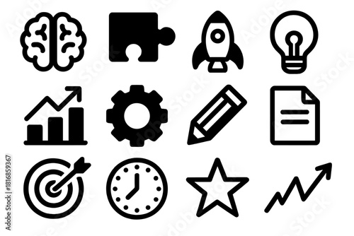 Bold Strategy Icons. Strategic Creativity silhouette icon set: brain, puzzle piece, rocket, light bulb, chart, gear, pencil, paper, target, clock, star, idea line