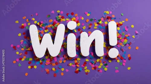 Bold "Win!" text amidst colorful confetti on a vibrant purple background, celebrating success