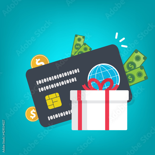 Bonus cash on credit bank card, present or money reward gift. Award program or promotion.