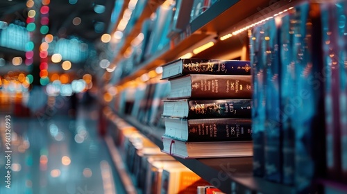 Book fair with diverse titles, lively and inviting, Urban, Soft tones, Photograph, Literary event