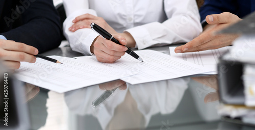 Bookkeepers team or financial inspectors making report, calculating or checking balance. Group of people at work. Business operations concept