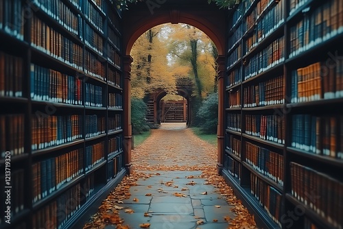 library, book, shelf, autumn, leaf, fall, garden, arch, pathway, cognition, education, literature, reading, research, history, old, antique, vintage, classic, wooden, stone, architecture, nature, tree, paseo, tranquil, peaceful, serene, scholarly, intellectual, wisdom, learning, study, bookshelf, corridor, passage, perspective, depth, detail, colours, scene, view, image