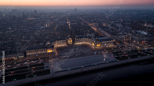 bordeaux, drone, night, city, bridge, architecture, light, river, distance, view, horizon, urban, town, travel, building, heaven, europa, panorama, dusk, water, evening, sunset, landscape