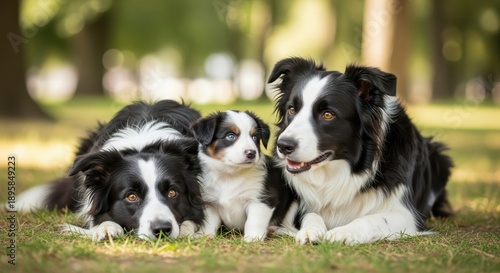border collie, dog, puppy, family, park, grass, outdoors, nature, pet, animal, mammal, domestic, cute, adorable, portrait, resting, lying down, sunshine, day, breed, black, white, fur, eye, ear, nose, paw, companion, friendly, happy, calm, relaxing, together, affection, love, care, bond, loyalty, environment, scenery, landscape, tranquil, peaceful, serene, closeup, detail, sharpened, soft, light