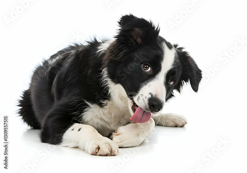 Border Collie Puppy Licking Paw on White Background Pet Portrait