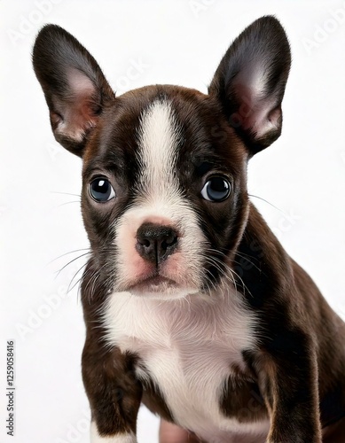 Boston Terrier puppy close up on white backdrop.