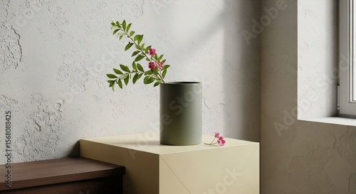 minimalism, still life, botanical, light, shadow, modern, interior, decor, plant, neutral, calm, serene, texture, wall, window, home, aesthetic, foliage, tree branch, indoor, studio, minimal, elegant, design, simplicity, stylish, contemporary, clean, fresh, olive, off-white, cream, beige, brown, dais, composition