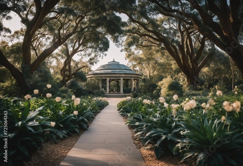 Botanical garden with white flowers and path to royal building in circle shape