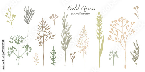 botanical illustration. Different types of field herbs in green and brown shades of flowers. Set of elements for your design. hand drawing.