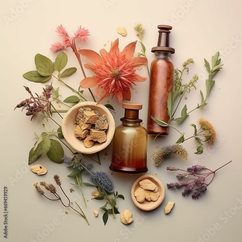 botanical illustration with plants Chinese medicine and cosmetics