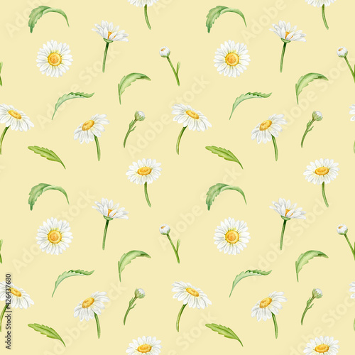 Botanical pattern with watercolor daisies on a beige background