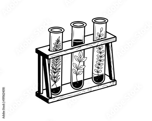 Botany Experiment Line Art: Plants Growing in Lab Test Tubes in Wooden Rack