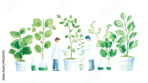 Botany lab, scientists studying plants, detailed observations, Watercolor style