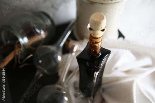 Bottiglia di aceto balsamico tipico di Modena in acetaia, primo piano