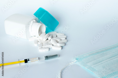 Bottle full of pills next to a syringe and a protective face mask on a white background. Coronavirus concept.