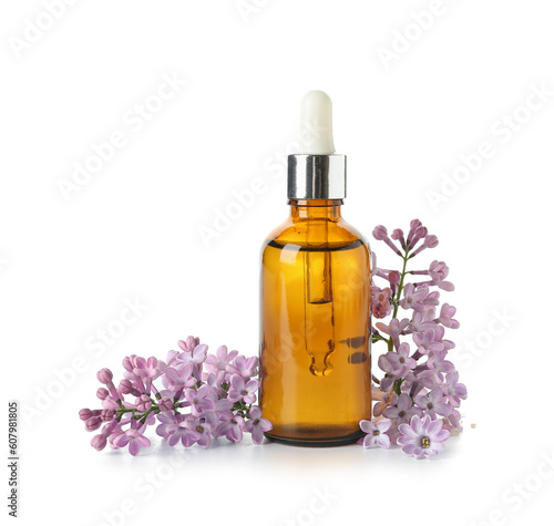Bottle of cosmetic oil with beautiful lilac flowers on white background
