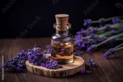 Bottle of lavender massage oil - beauty treatment. Created with generative AI tools