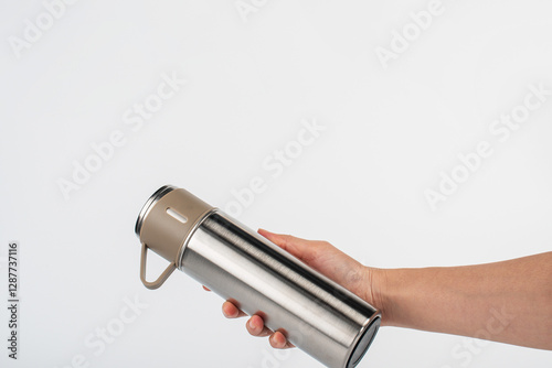 Bottle tumbler aluminium water glass and hand isolated white background.