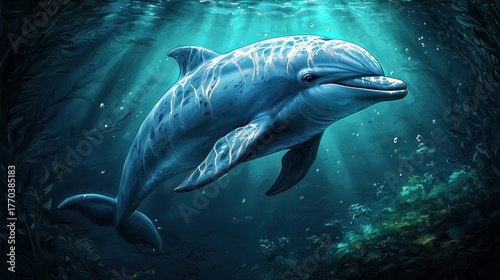 dolphin, ocean, sea, water, marin, mammal, animal, wildlife, nature, aquatic, underwater, swimming, sunbeam, light, ray, coral, reef, seaweed, kelp, bubble, blue, dark, deep, creature, vertebrate, playful, friendly, elegant, graceful, beauty, wild, life, seascape, environment, ecology, biodiversity, conservation