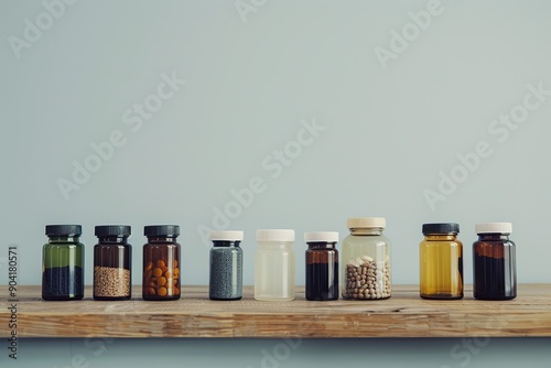 Bottles of vitamins and supplements arranged neatly on a wooden table