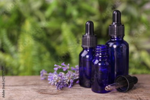 Bottles with natural lavender essential oil on wooden table against blurred background. Space for text