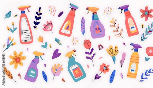 Bottles with spray and flowers, green leaves on white background for cleaning concept. Eco cleaning
