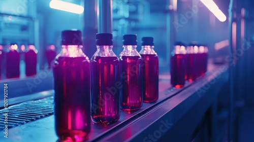 Bottles with vibrant liquid on a conveyor belt under neon blue and pink lighting in a futuristic factory, symbolizing modern automation. Perfect for industrial themes.