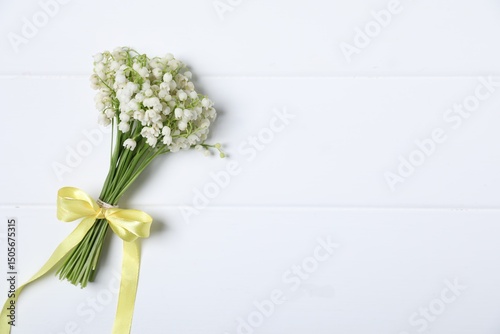 Bouquet of beautiful lily-of-the-valley flowers on white wooden background, top view. Space for text