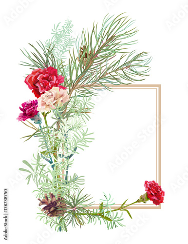 Bouquet of carnation, white, red flowers, green twigs asparagus, pine branches, cones, white background. Frame for Christmas, Mother's Day, digital draw, illustration in watercolor style, vector