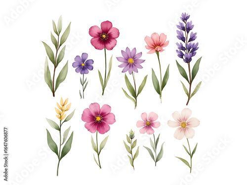bouquet of flowers. Watercolor flower with green leaves. floral frame and background. flower border illustration set. Watercolor floral illustrations set on white background