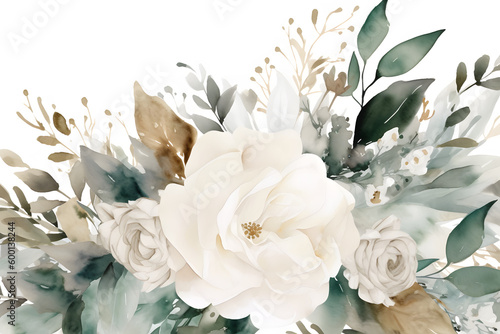 bouquet of white roses on white background, in the style of soft watercolors, light emerald and beige, generative ai