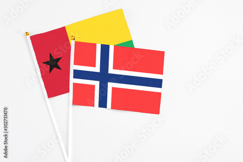 Bouvet Islands and Guinea Bissau stick flags on white background. High quality fabric, miniature national flag. Peaceful global concept.White floor for copy space.