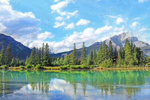 Bow river view from Banff village, beautiful typical Canadian nature - mountains and pine tree's reflection in the clear cyan water.
