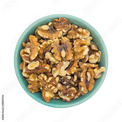 Bowl filled with shelled walnuts on a white background