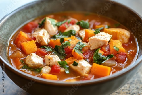 Bowl of chicken stew with sweet potatoes, tomatoes, and greens. Showcase healthy eating, comforting meals, or seasonal autumn dishes.