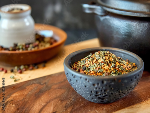 bowl of colorful spice mix on wooden surface, enhancing culinary creativity