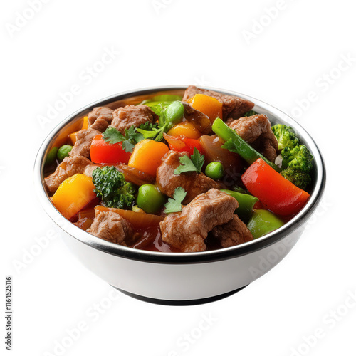 bowl of colorful stir-fried meat and vegetables. showcasing a vibrant mix of broccoli. bell peppers. and peas. all coated in a savory sauce the dish is presented in a sleek bowl. emphasizing its appet