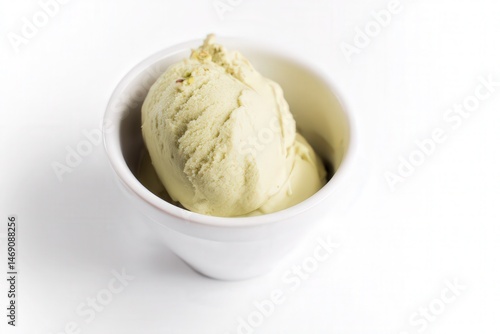 Bowl of creamy green matcha ice cream on white marble surface