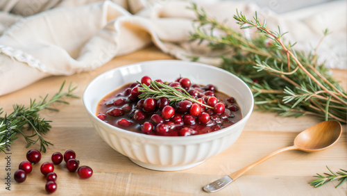 Bowl of fresh cranberry sauce garnished with rosemary on rustic table during Thanksgiving dinner