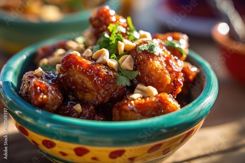 Bowl of Glazed Chicken Bites with Peanuts and Cilantro, Colorful Ceramic Bowl