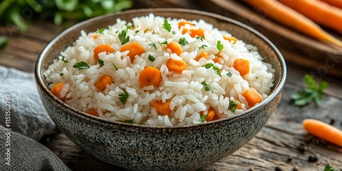Bowl of rice with carrots set against a rustic wooden background, highlighting the vibrant colors of rice and carrots, perfect for portraying wholesome and nutritious meals.