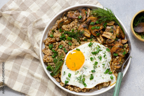 Bowl with buckwheat, fried mushrooms and fried egg for breakfast. vegeterian dish